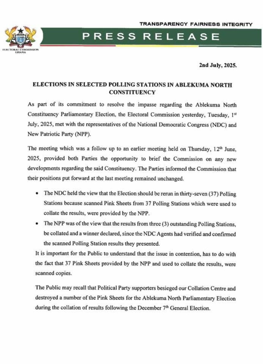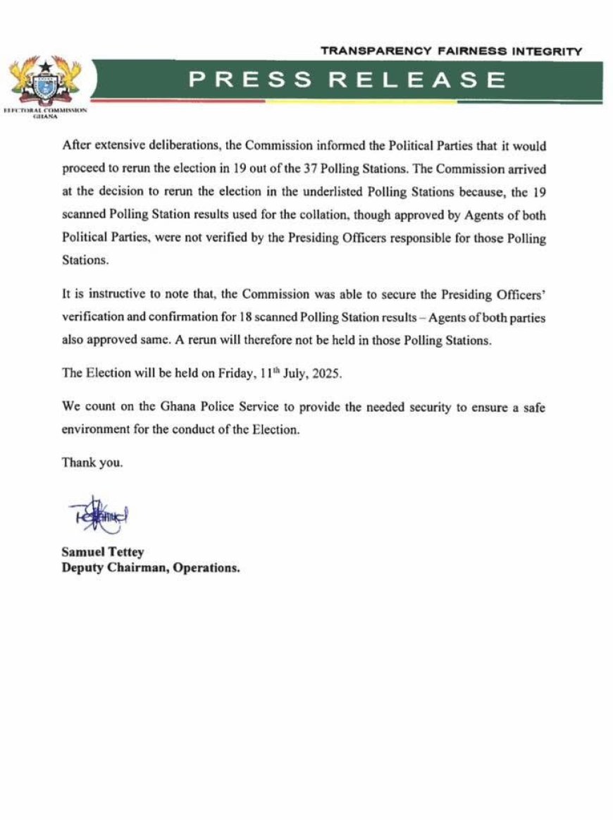 Accra, Ghana - 2 July, 2025 - The Electoral Commission (EC) of Ghana has announced that it will rerun the parliamentary election in 19 polling stations in the Ablekuma North constituency in the Greater Accra region on July 11.