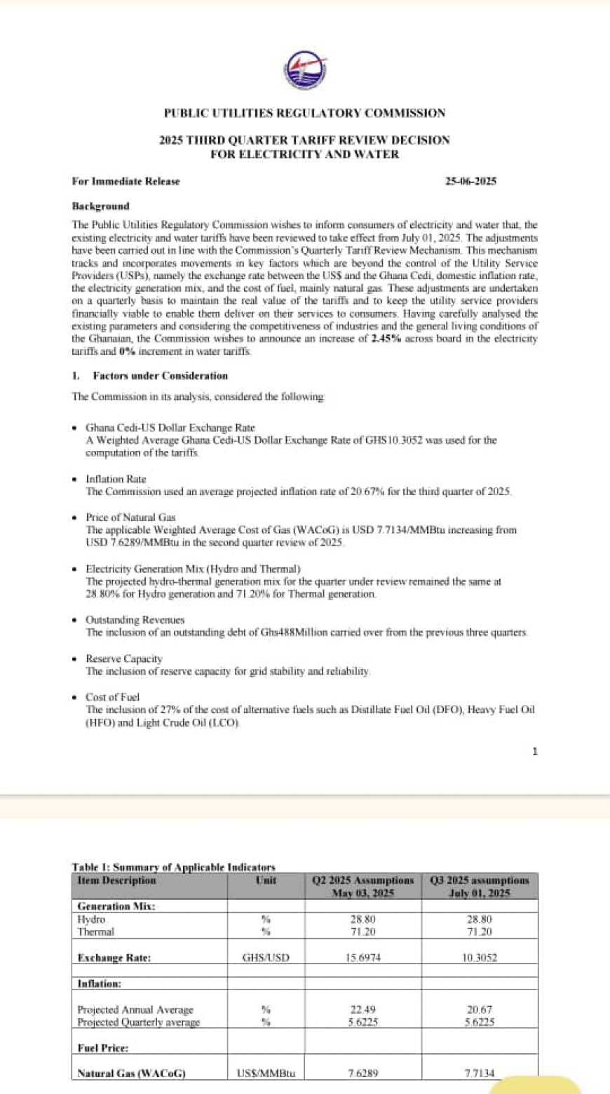 Accra, Ghana - 25 June, 2025 - The Public Utilities Regulatory Commission (PURC) has announced a 2.45% increase in electricity tariffs for all customer categories, effective July 1, 2025.