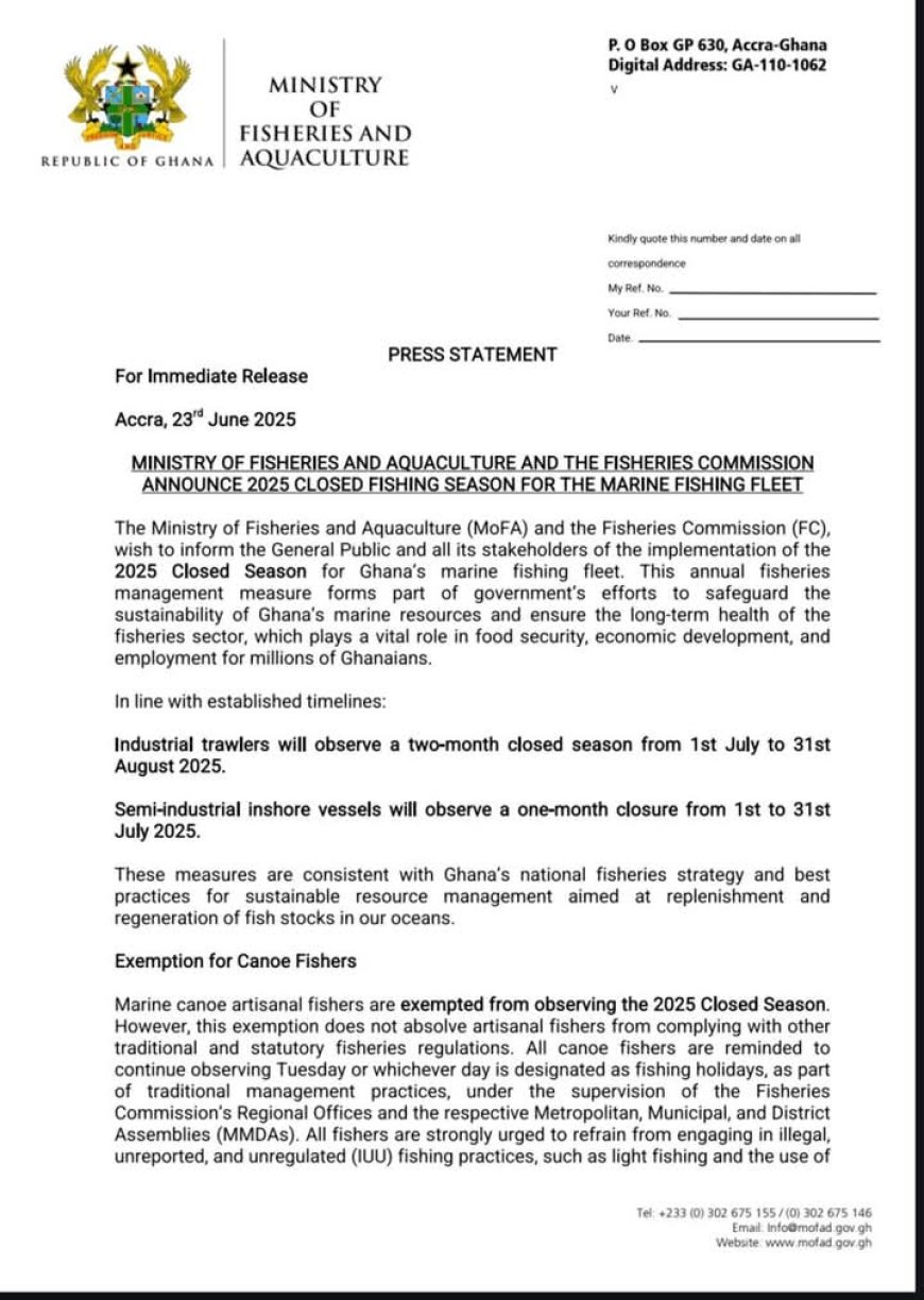 Accra, Ghana - 23 June, 2025 - The Ghanaian government has announced a month-long closed season for inshore fleets, effective July 1 to July 31, 2025, as part of efforts to protect and sustain the country's marine resources.