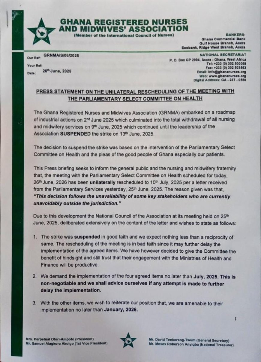 Accra, Ghana - 26 June, 2025 - The Ghana Registered Nurses and Midwives Association (GRNMA) has voiced its disappointment and frustration over the postponement of a crucial meeting with the Parliamentary Select Committee on Health. The meeting, initially scheduled for June 26, 2025, has been rescheduled to July 10, 2025, citing the unavailability of key stakeholders.