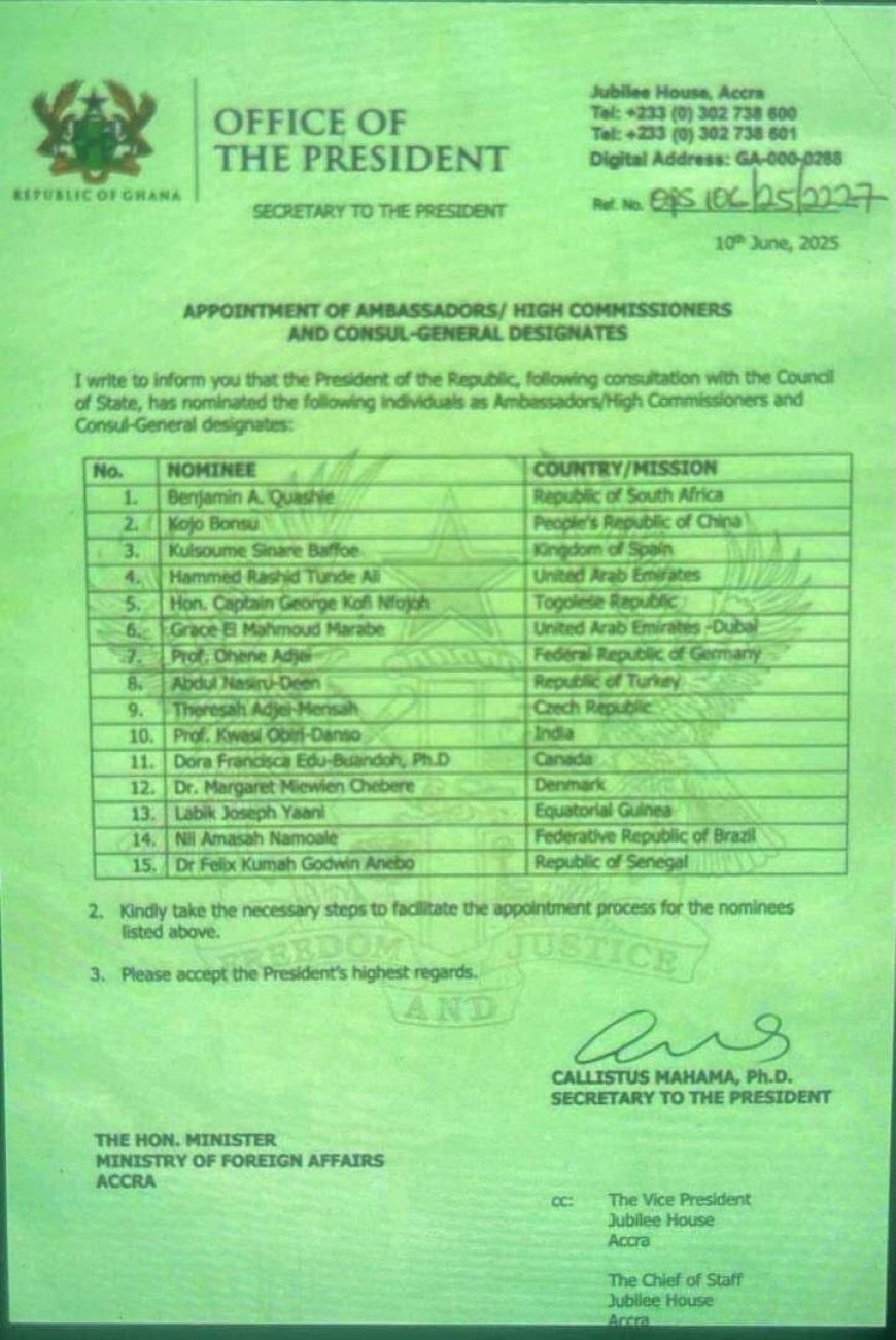 Accra, Ghana - 21 June, 2025 -In a significant move to strengthen Ghana's diplomatic presence globally, President John Mahana has announced the appointment of his first batch of ambassadors.