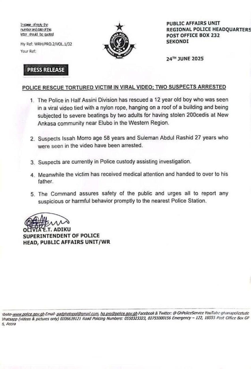 New Ankasa, Western Region - 24 June, 2025 - The Ghana Police Service has successfully rescued a 12-year-old boy who was subjected to severe physical abuse in a disturbing incident that sparked widespread outrage. The boy, who was allegedly accused of stealing GH₵200, was viciously beaten by two men in a video that went viral on social media.